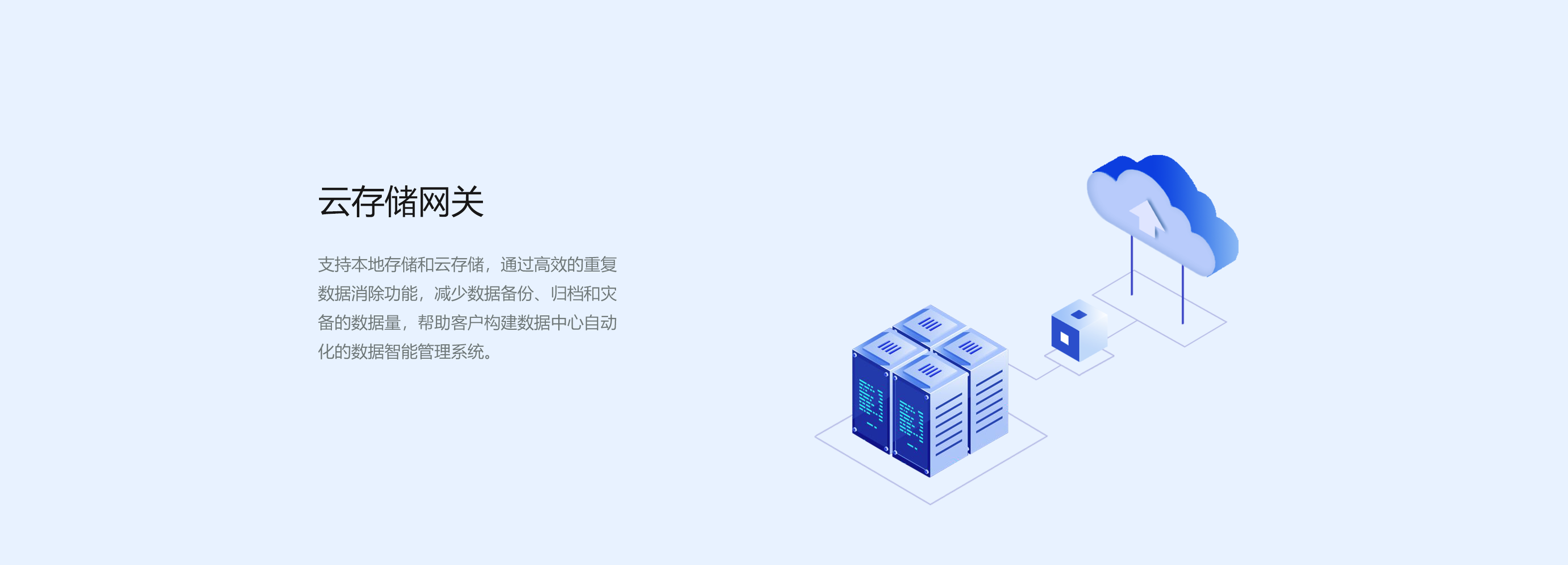 支持本地存储和云存储,通过高效的重复数据消除功能,减少数据备份、归档和灾备的数据量,降低数据存储容量和成本,提升数据利用效率,提高基于网络复制到灾难恢复站点的可靠性。